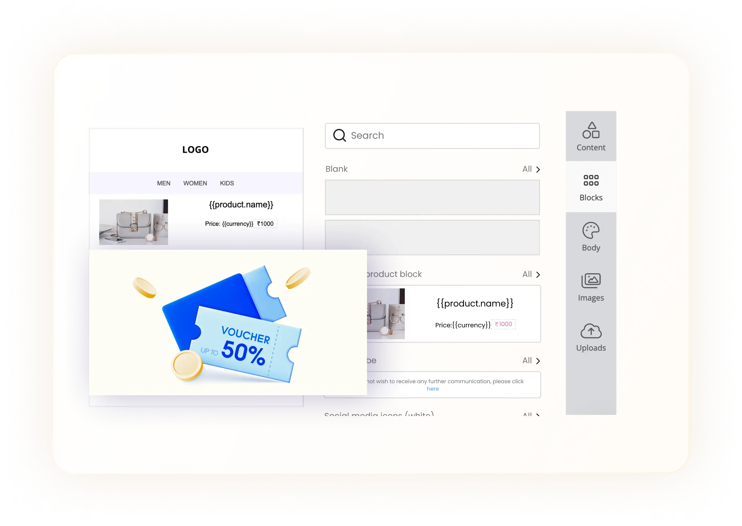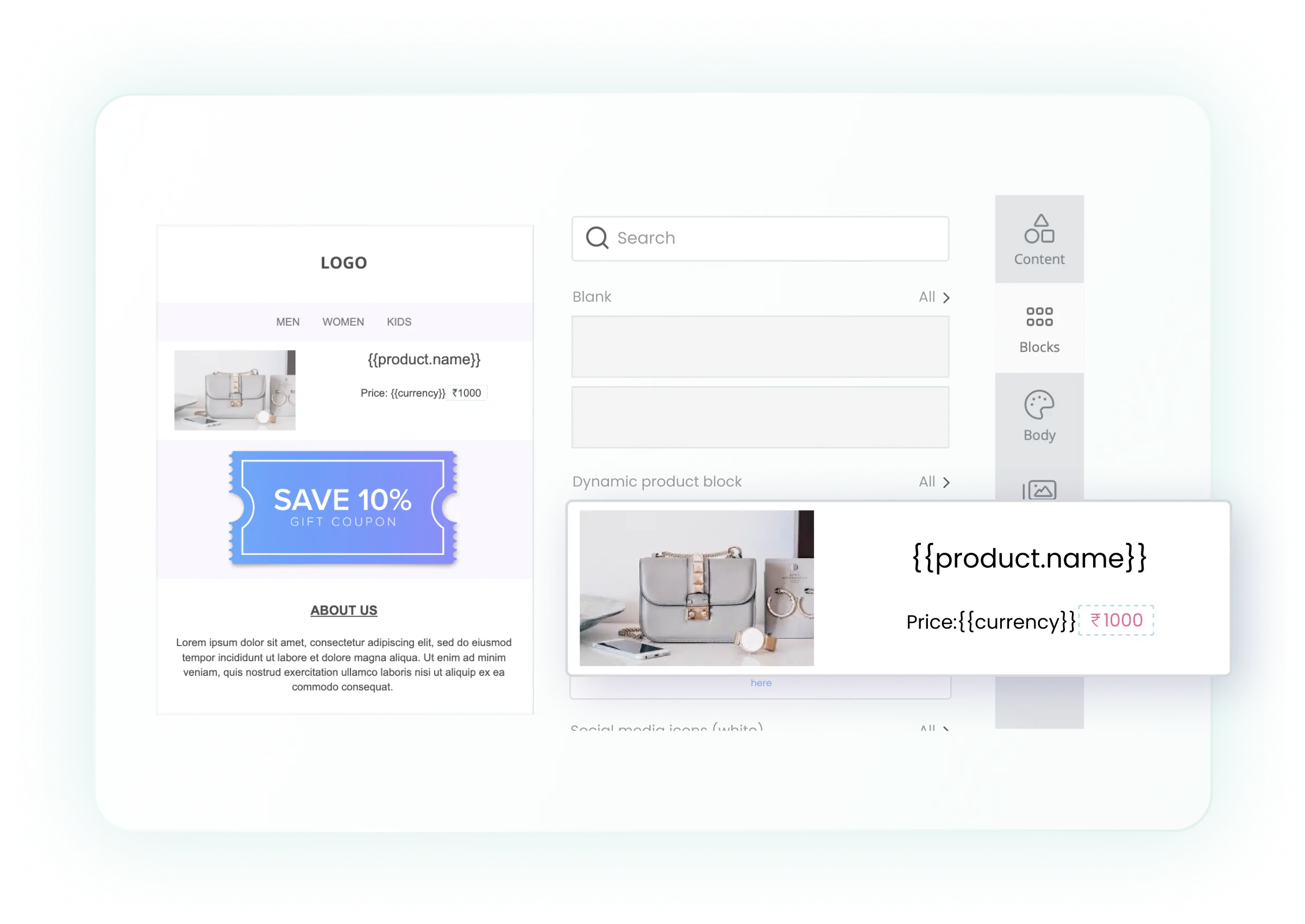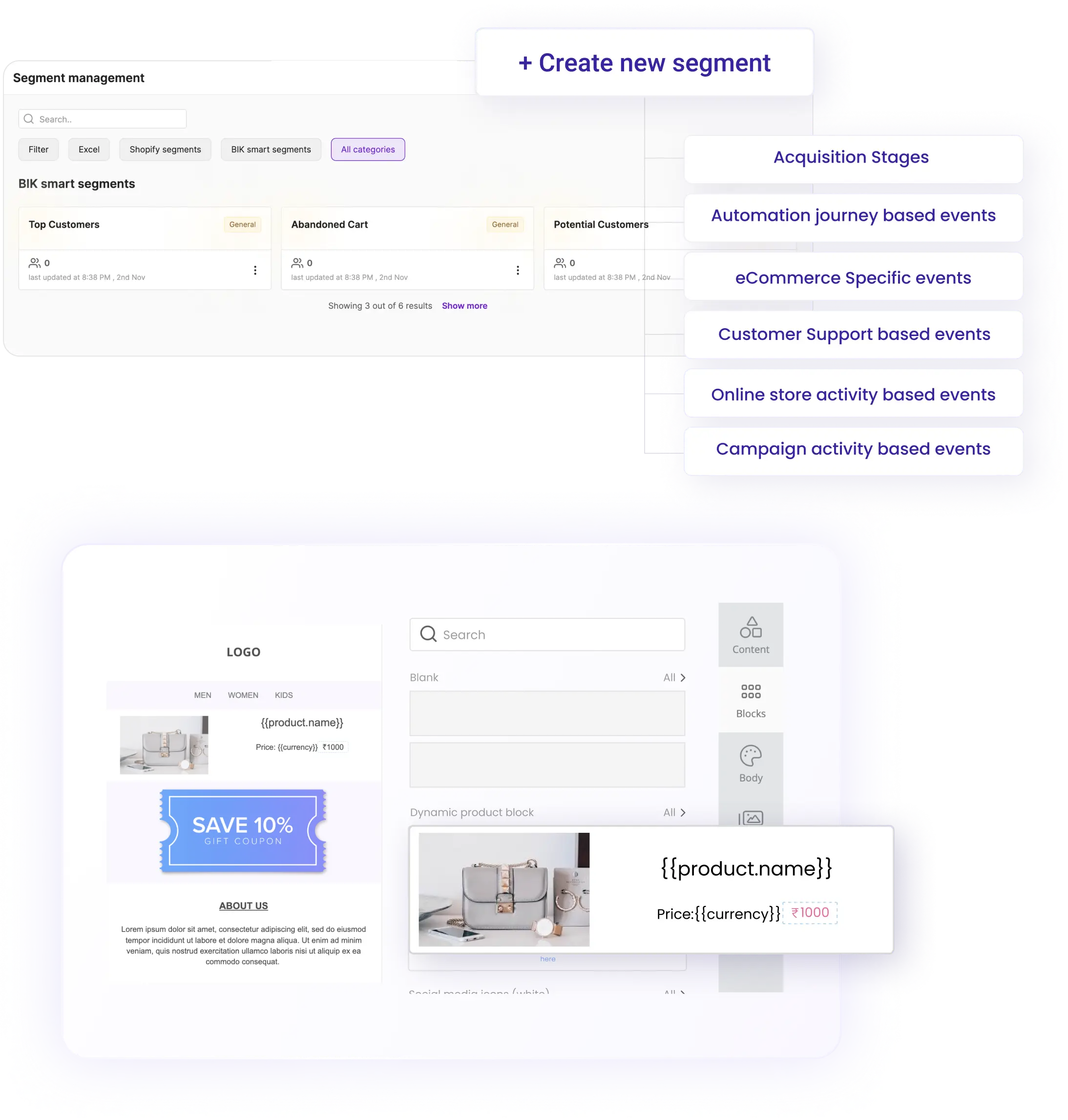 - Dynamic Product Cards: Insert product recommendation blocks (best‑selling, new, similar, abandoned cart items) directly into emails.