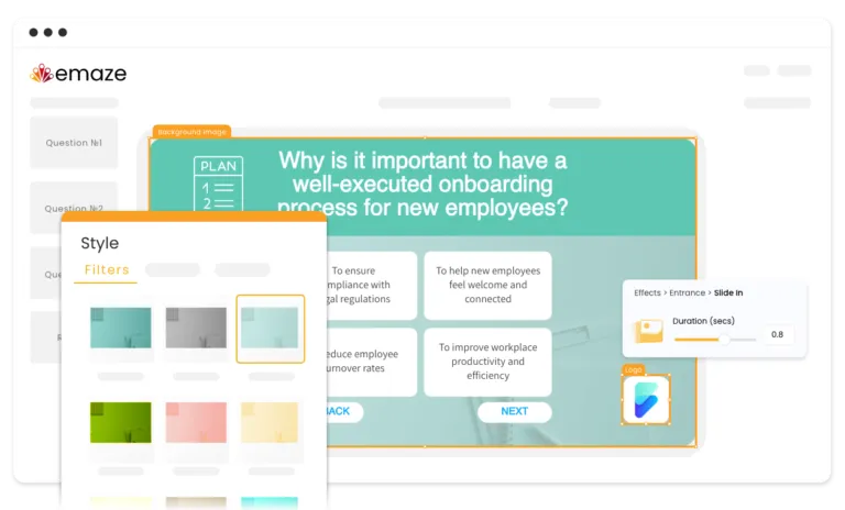 - Create visually appealing content with interactive design elements like transitions, styles, and effects to keep learners engaged.