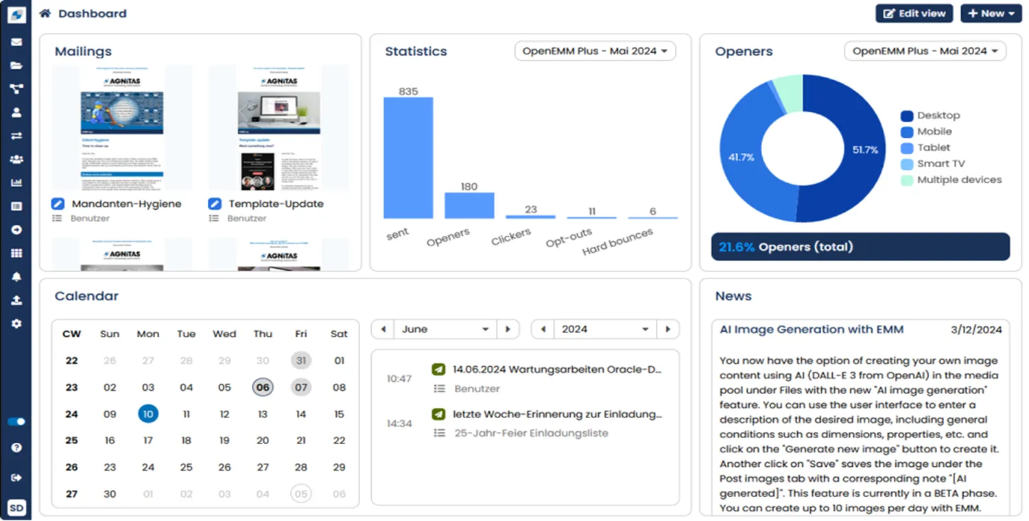 EMM SaaS (E-Marketing Manager Software as a Service) is AGNITAS’ cloud-based digital marketing suite designed for businesses seeking a powerful, secure, and maintenance-free email marketing solution. It enables users to focus on campaign creation while AGNITAS handles all technical operations, including hosting, updates, and infrastructure.