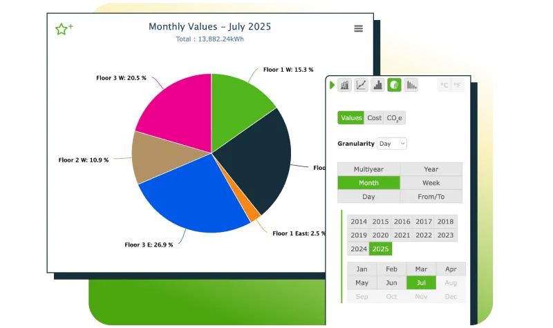 Identify consumption trends over time and calculate your savings. Enter adjustment values and monitor KPIs relevant to your organization.