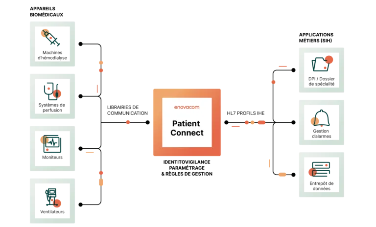 Enovacom Patient Connect is a biomedical interoperability platform that connects bedside and mobile medical devices to clinical systems. It acquires data from heterogeneous devices, performs secure patient–device association at the point of care, and delivers data in real time to the electronic health record and mobile nursing applications. The platform supports wired and wireless workflows, enabling continuous data capture during patient transfers and across care phases, reducing manual transcription and errors while improving timeliness and data completeness.