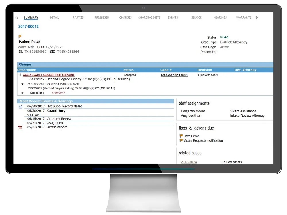 Comprehensive case management solution for prosecuting attorneys and public defenders.