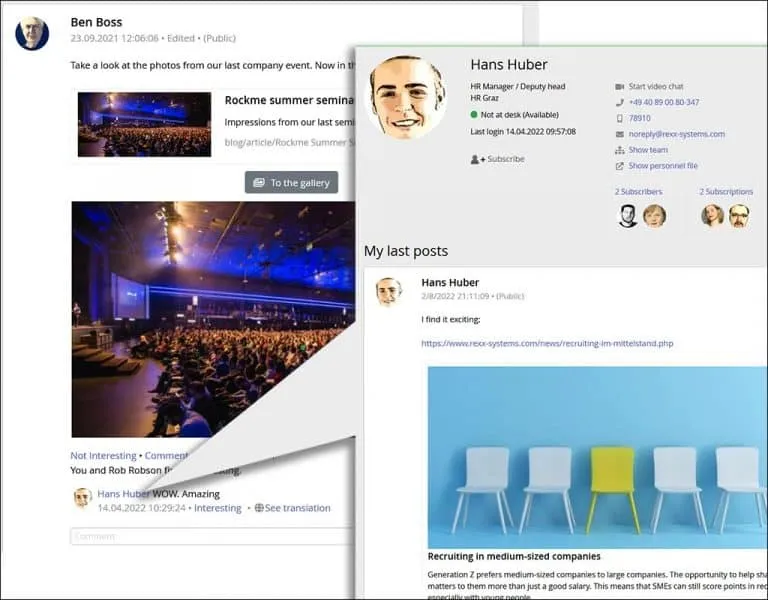 rexx HR offers a comprehensive ESN module for the employee portal. Employees are able to post contributions in a “stream” – similar to the Facebook or Xing newsfeed. They can report that they won a new customer or have successfully concluded a project – to enhance transparency and communications throughout the entire company.