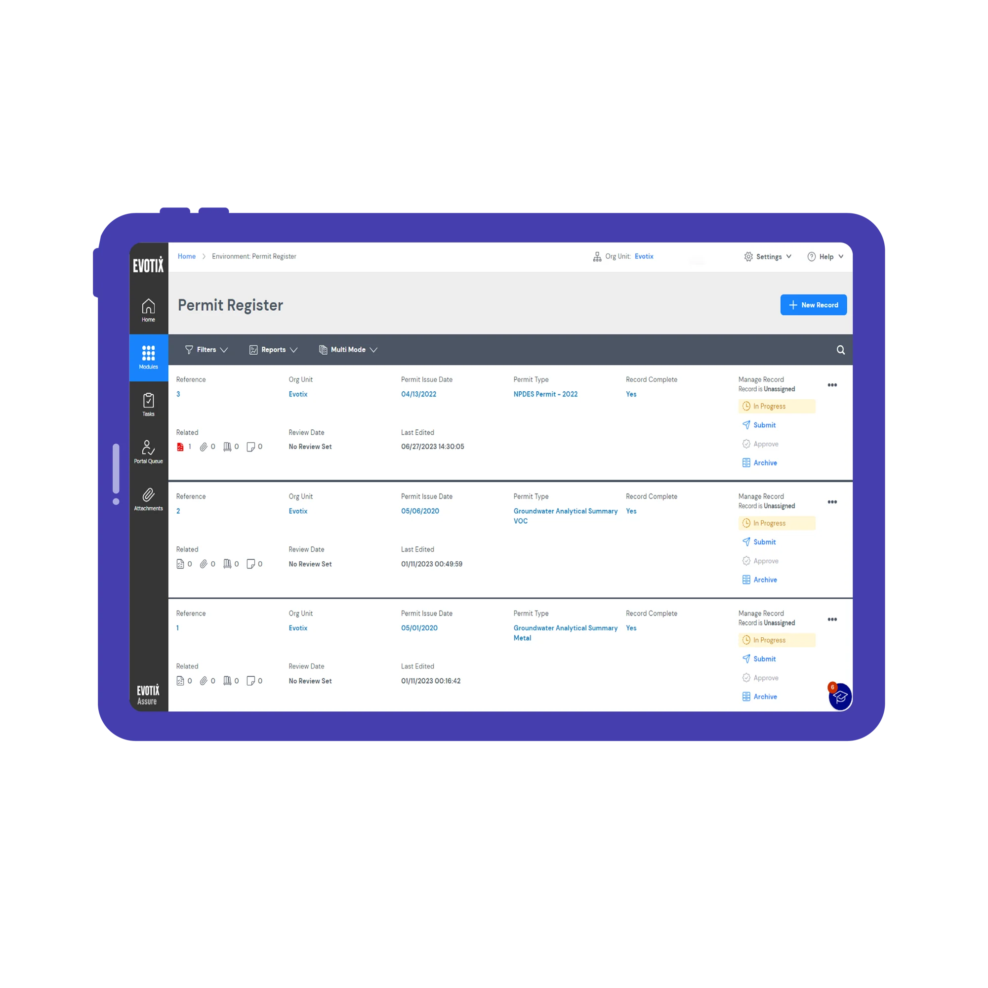 - Task & Action Management: Automate reminders and manage tasks associated with permit reviews, renewals, or corrective actions to reduce manual workload and enhance accountability.