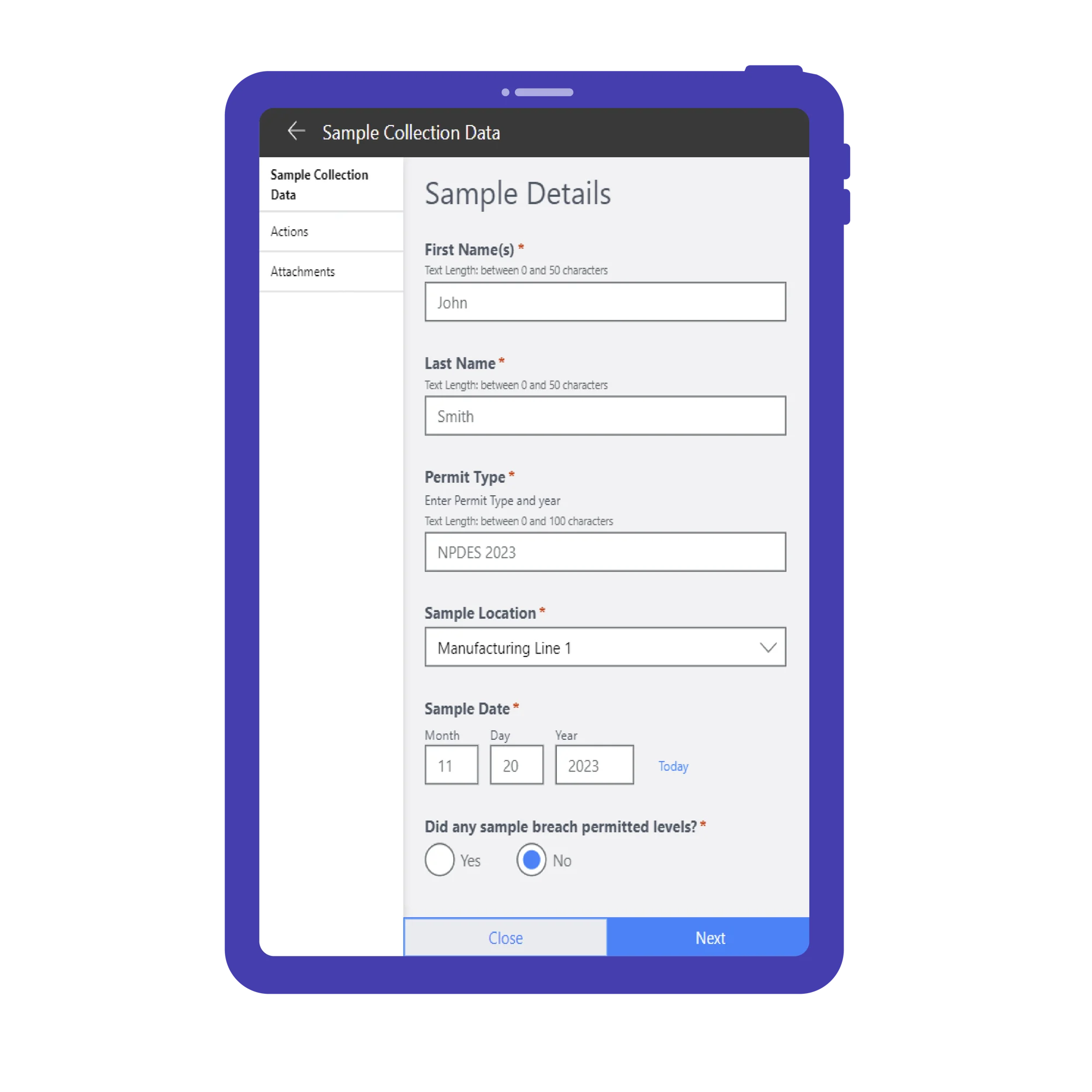 - Sample Tracking & Data Capture: Record environmental samples such as soil, air, and water against relevant permits; external consultants or laboratories can contribute or import data to ensure consistent data collection.
