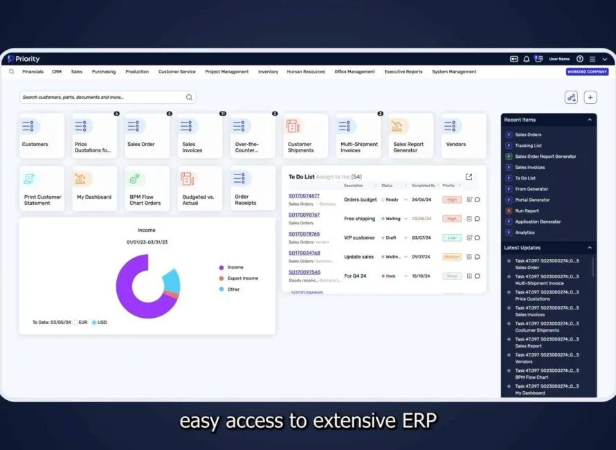Priority ERP is a comprehensive, cloud-based enterprise resource planning platform designed to streamline and optimize business operations across a wide range of industries. Built on an open, scalable architecture and powered by AWS, Priority ERP integrates core business functions into a single, intelligent system. It supports everything from financials and CRM to manufacturing, supply chain, HR, and mobile access—enabling organizations to drive efficiency, agility, and growth.