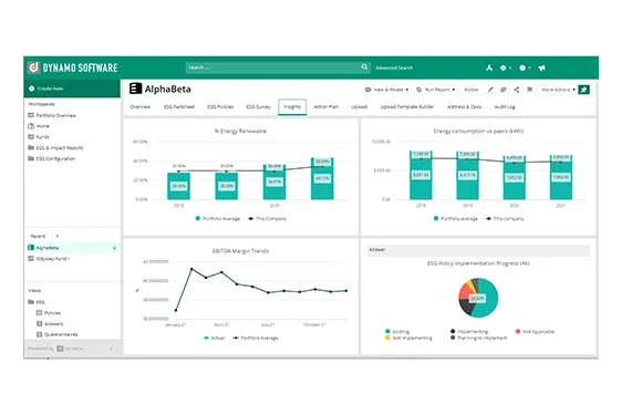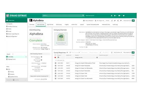 Responsible investing is top of mind. Building out programs, standardizing and analyzing data, and even knowing where to start can be manual and daunting. With Dynamo, firms with fledgling ESG and Impact portfolios can see core metrics and practices, while more established programs can manage custom questions and create detailed analysis. The ESG & Impact module works with existing frameworks and taxonomies, letting you cross-map and tag data points and retain data integrity as question framing changes over time. Dynamo’s secure, searchable database and configurable question bank ease the collection and storage of due diligence and annual survey outputs. Our interactive dashboards facilitate tracking the success of Impact & ESG Initiatives. Whether you have a developed ESG or Impact program, or are just getting started with responsible investing, Dynamo has the tools you need to gather data, monitor KPIs, create action plans, and track your success.