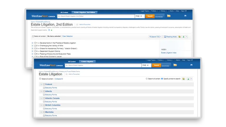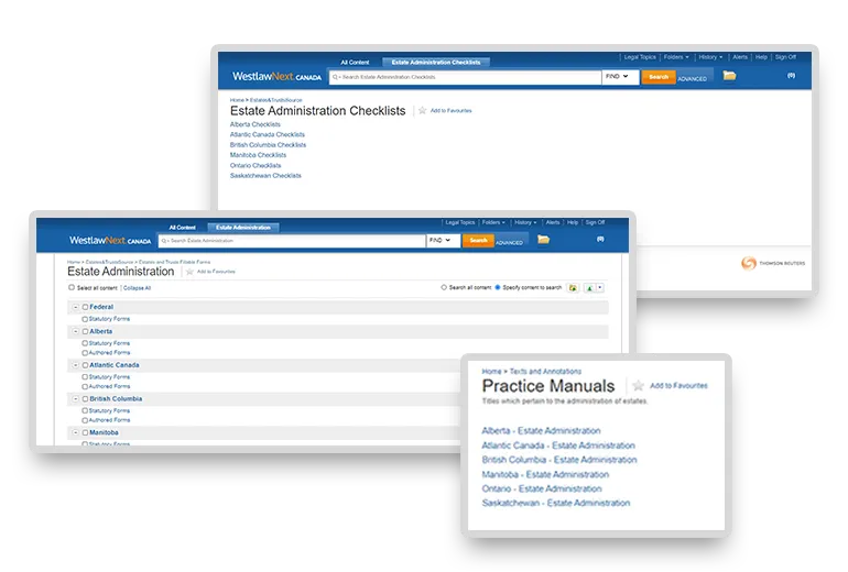 - **Estate Administration: **Access commentary and practical guidance along with a collection of forms and letters used in estate administration. Fillable statutory and authored forms such as checklists, letters, and precedents reduce the time spent drafting, editing and entering repetitive information. Court forms are fully formatted according to varying provincial standards and ready for filing. Printable checklists ensure that you don't miss any steps or information.