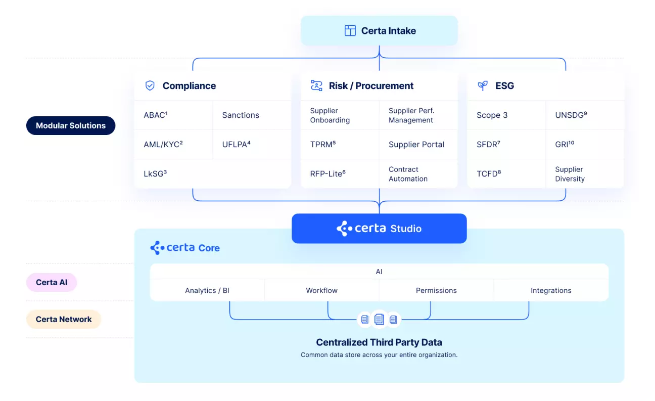 - Unified Process Orchestration: Covers all compliance domains including screening, financial crime, supply chain risk, and reputational risk.