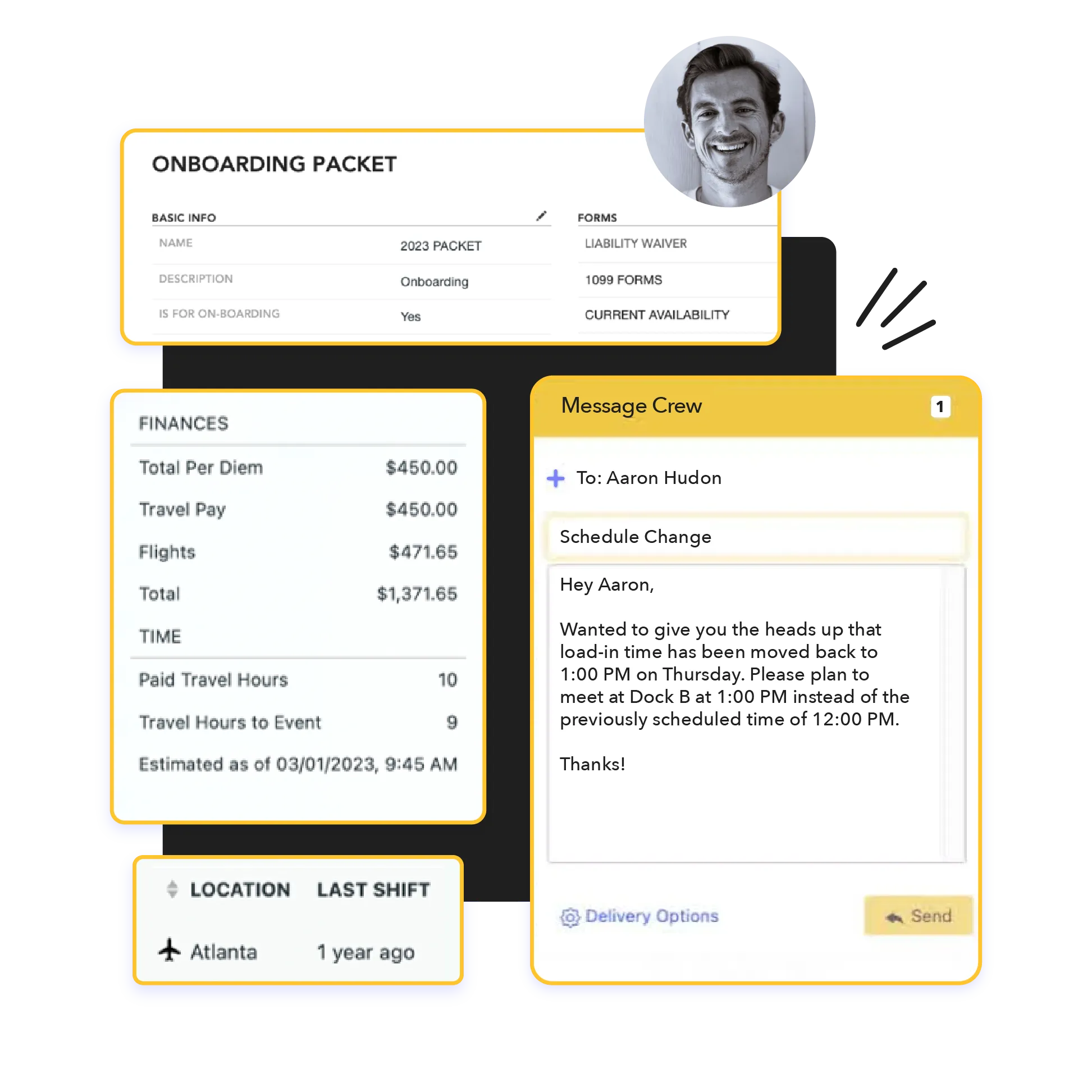 Manage event crews from onboarding to payroll with one platform that simplifies scheduling, travel, and communication.