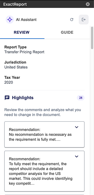 ExactReport is a virtual transfer pricing assistant designed for transfer pricing professionals. It integrates directly into Microsoft Word, providing a secure environment to review local files and ensure compliance with the unique and evolving regulations of every jurisdiction. The AI-powered tool identifies gaps, suggests real-time adjustments, and helps firms produce higher-quality, country-compliant reports faster. Benefits include accelerated client scoping, smoother internal reviews, easier expansion into new markets, and reduced audit risk. ExactReport does not use client data to train its AI models.