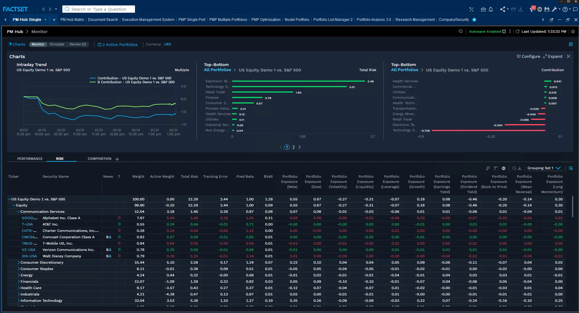 Clearly analyze investment portfolio composition, performance, and risk exposure with the ability to flag outliers in real time. Our PM Hub solution lets you incorporate your own data and custom scoring and analytics into your daily analysis. Leverage customizable visuals to chart movement in the portfolio, top and bottom performers, and overall portfolio performance. Use risk metrics such as VaR, Tracking Error, Predicted Beta, and Total Risk to recognize potential portfolio vulnerabilities. Incorporate FactSet's optional full risk dataset for a detailed risk factor analysis.