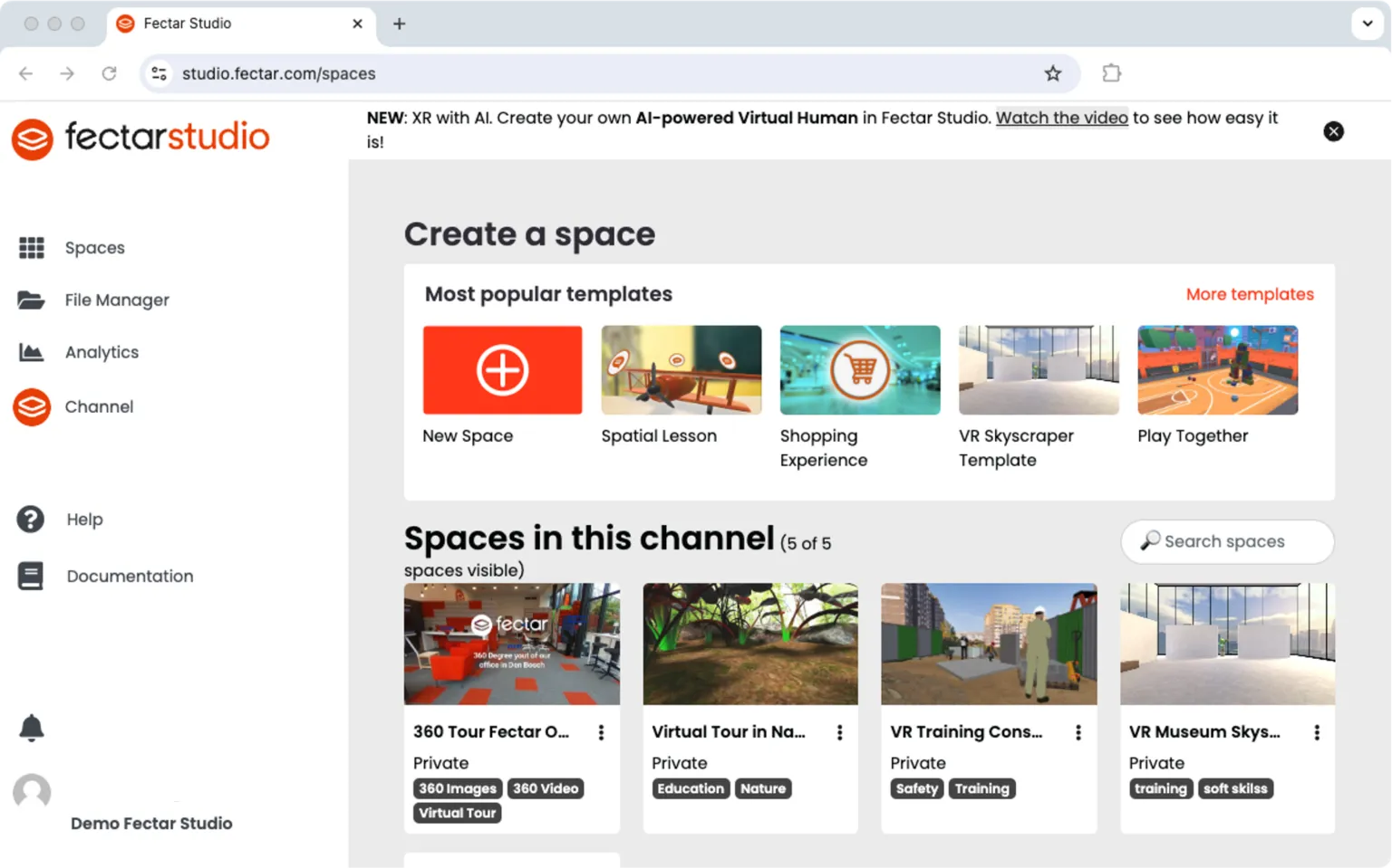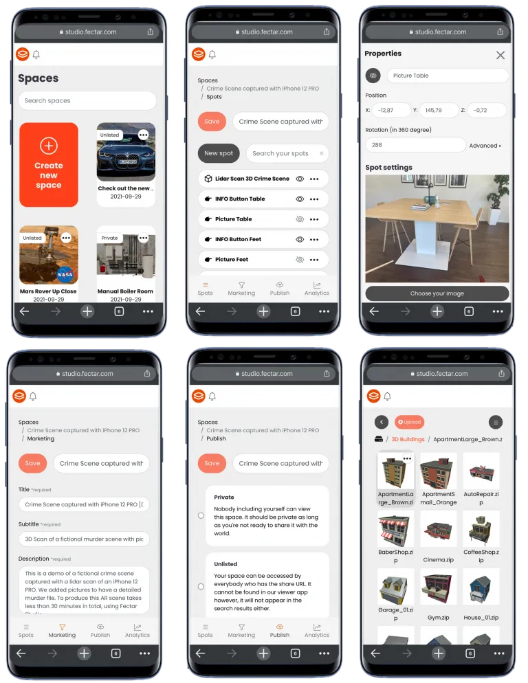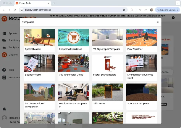 Fectar Studio is a cloud-based, no-code/low-code platform for creating, publishing, and managing interactive Virtual Reality (VR) and Augmented Reality (AR) experiences. Designed for users without programming or 3D design expertise, it enables the rapid development of immersive 3D spaces using a library of templates, 3D objects, images, holograms, and interactive elements such as buttons, questions, and feedback forms. Fectar Studio supports publishing to a wide range of devices—including smartphones, tablets, VR headsets (Meta Quest, Pico Neo), AR glasses, and web browsers—allowing creators to reach audiences on their preferred platforms. The platform includes robust analytics, such as heatmaps and user activity tracking, and offers multi-user, multi-device collaboration. Content can be set as private, unlisted, protected, or public, and the system is suitable for education, training, marketing, and business presentations. Fectar Studio is used by schools, universities, and businesses to democratize access to AR/VR content creation and distribution.