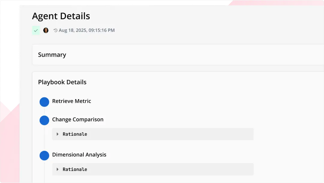 - Actionable Playbooks: Pre-built playbooks guide AI agents for consistent, reliable, and auditable insight generation.