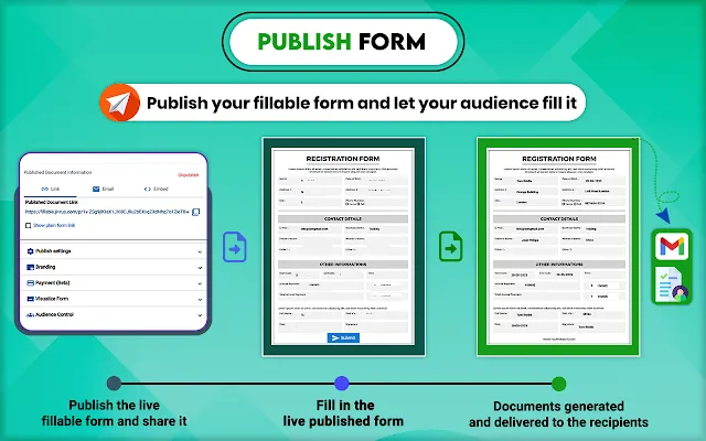Generate merged Google Docs, PDF from Google Sheets and deliver via email. Make live Fillable Form to store, publish and deliver.