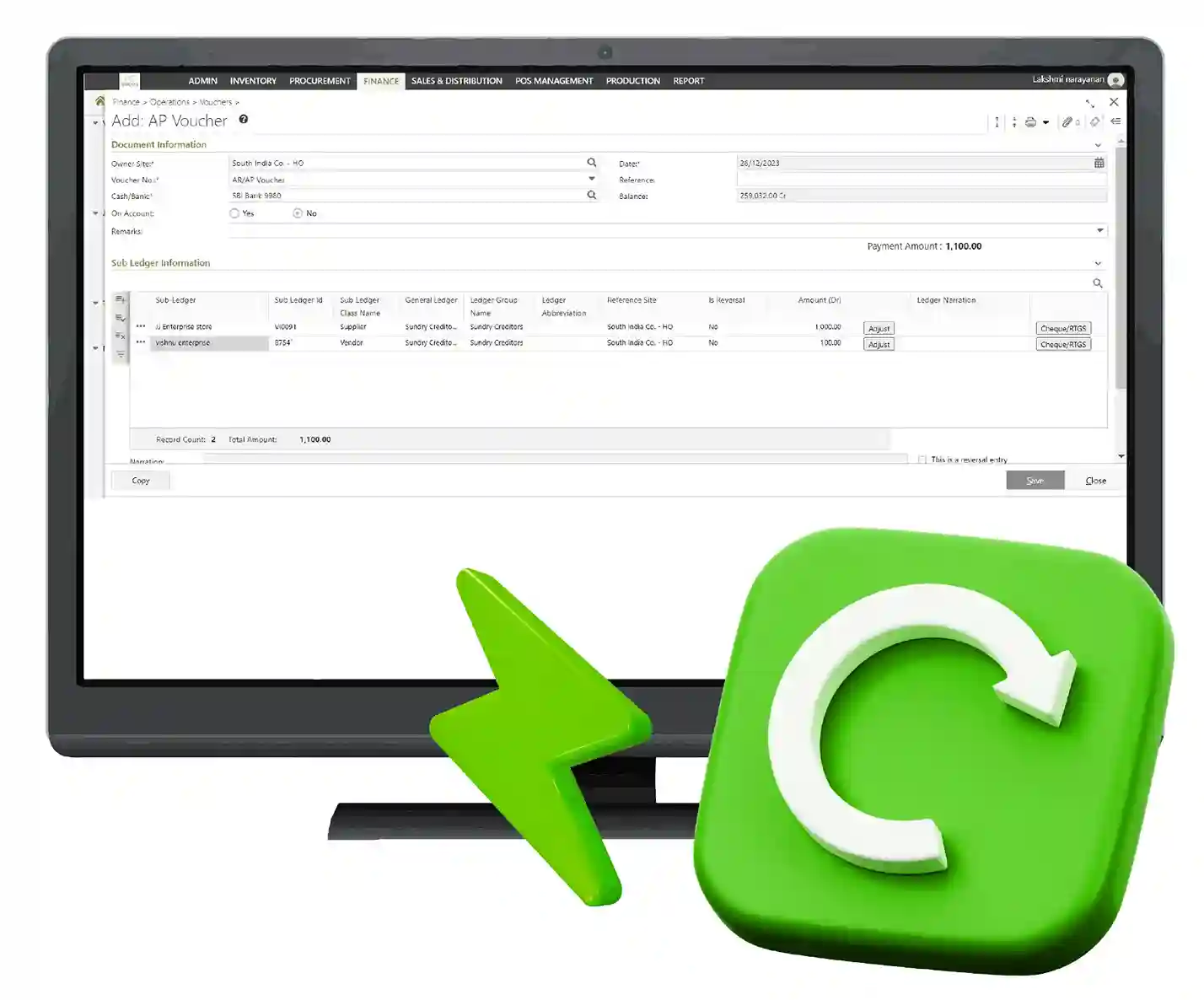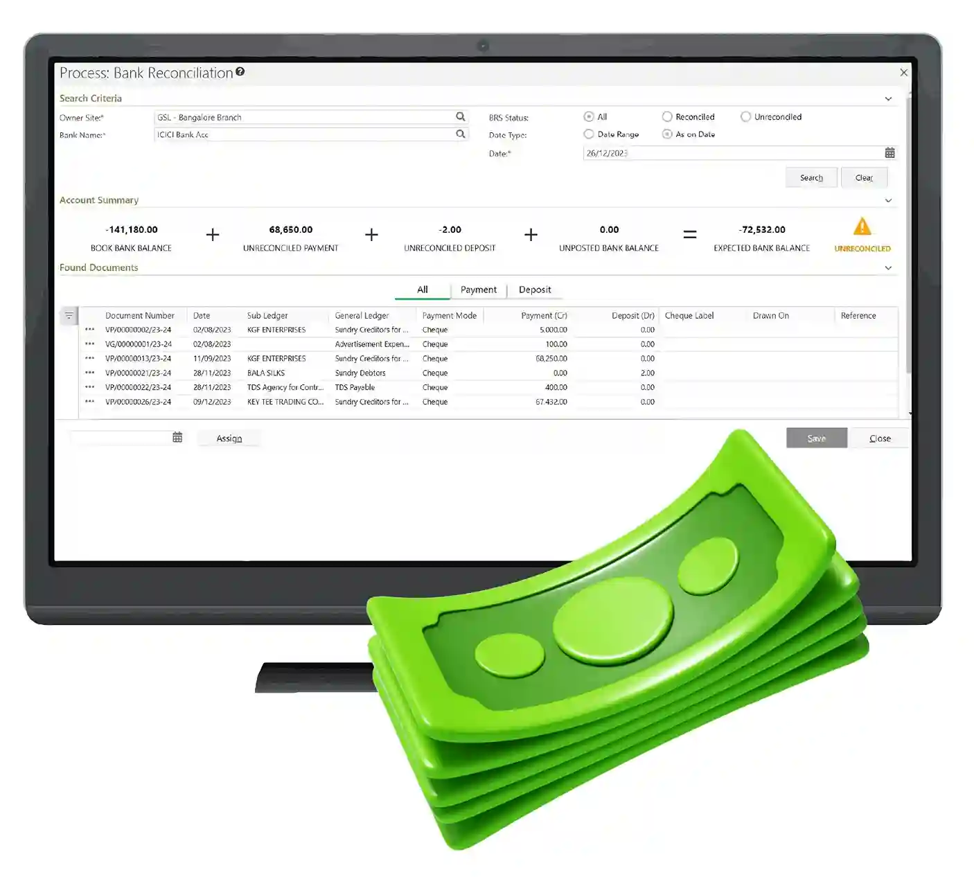 Easy Accounting with Bulk Operations of AR, AP and Cash As a central repository of financial information, Ginesys ERP’s finance module, helps track payments to vendors, jobbers, agents, transporters, employee expenses and salaries. It also helps track the customer payments and balances due. Finally it helps with cash management to understand the fund flow including making bank transactions and doing the ‘bank reconciliation’ of entries in bank statements with the entries in the system.