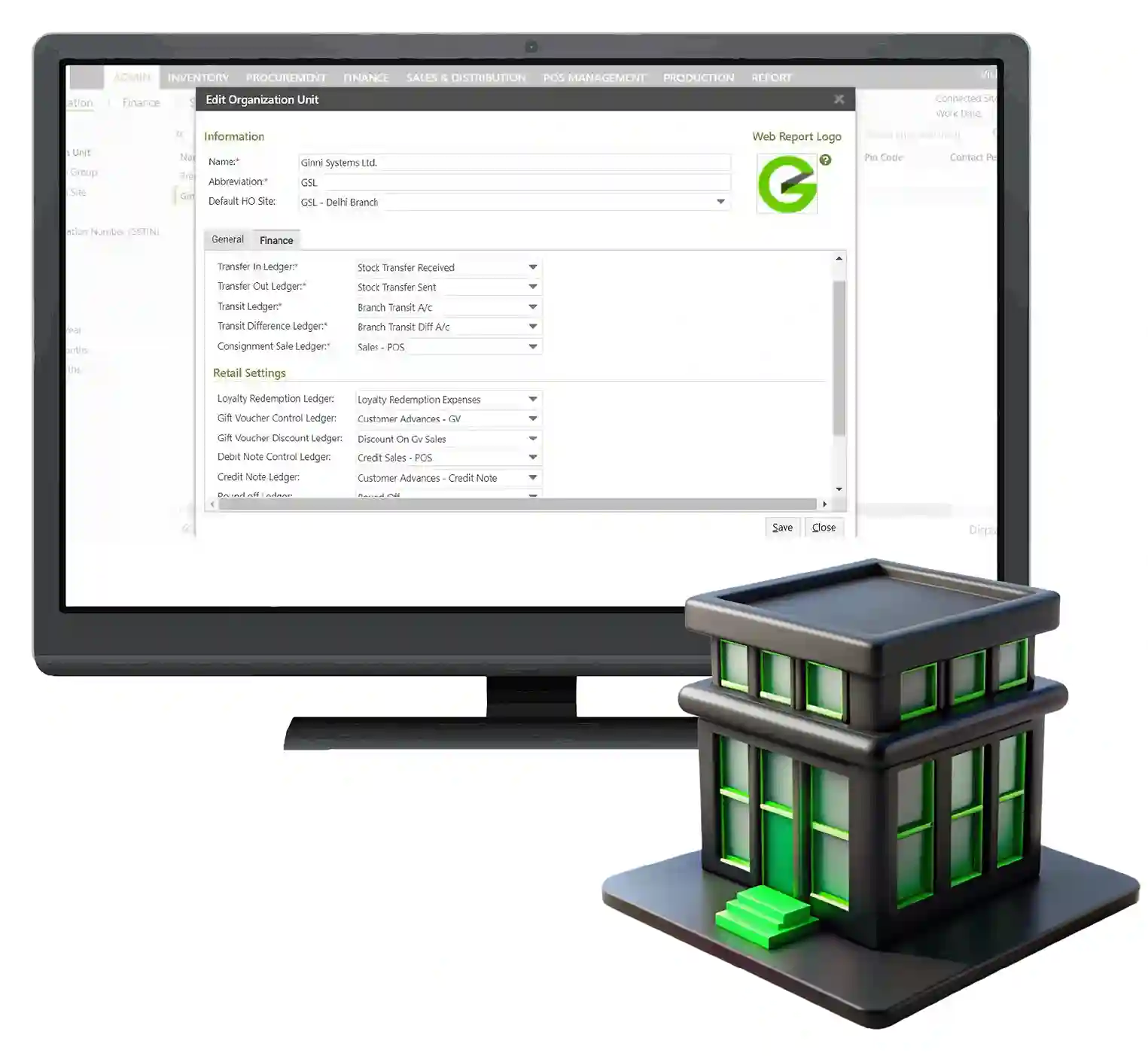 Manage Multiple Companies Ginesys ERP has a concept of ‘organization unit’, which can be used to map to various accounting entities. This functionality makes it easy to manage different entities having many inter-party transactions as well as having a common set of users.