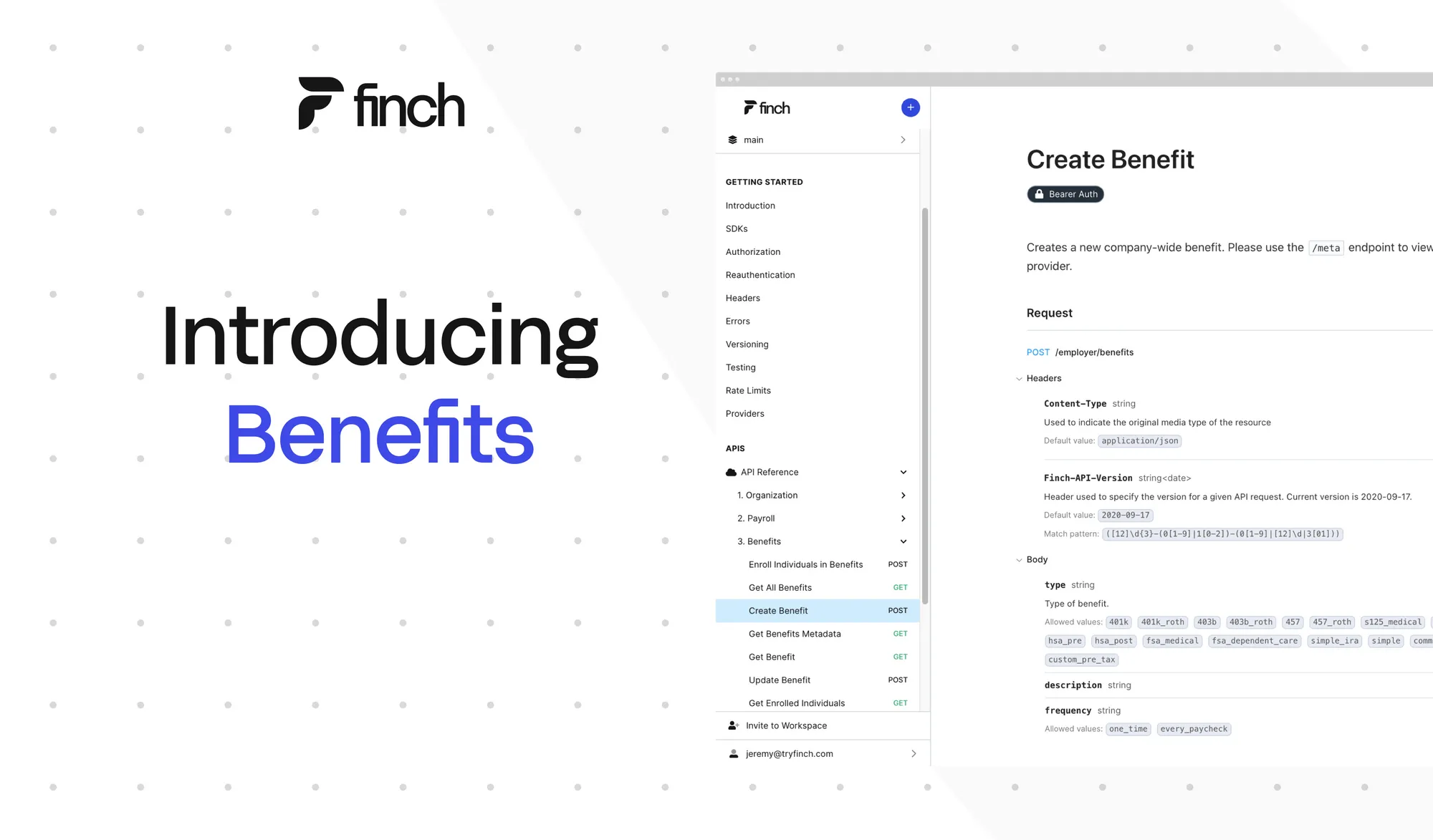 Finch Deductions is an API-based solution that enables businesses to manage the full lifecycle of payroll deductions and contributions seamlessly. It allows benefits platforms and service providers to create, update, and retrieve deduction data directly from payroll systems without manual processes like CSV uploads or SFTP transfers. This unified approach simplifies benefits administration, improves accuracy, and accelerates employer onboarding.