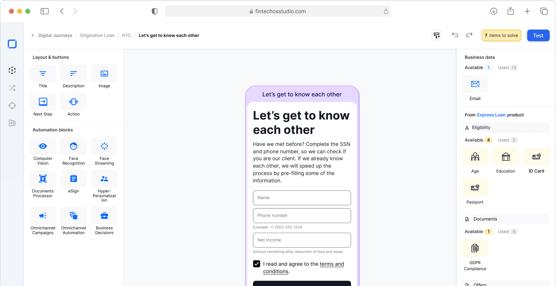 Part of the FintechOS platform, FintechOS Studio is a low-code/no-code builder that enables anyone – regardless of their technical skills or background – to create and launch data-driven financial and insurance products and customer journeys.