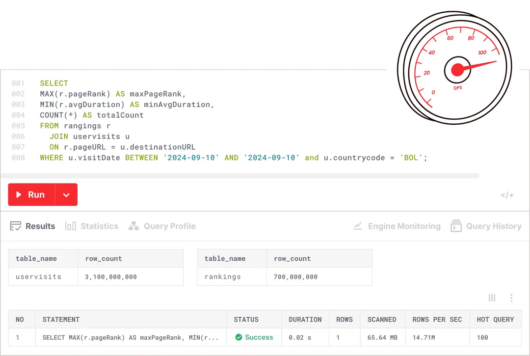 - Sub-Second Query Execution: Delivers lightning-fast analytics for customer-facing and AI applications.