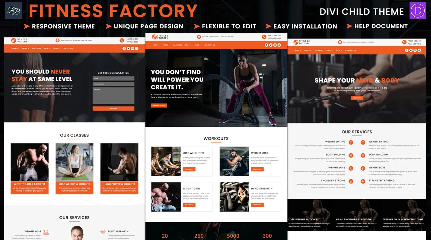 Fitness factory is modern and elegant Multi Page Divi Child Theme which is suitable for fitness, gym, workout, exercise, sports, health, yoga, personal trainer, body builder, body building, gym coach, fitness center, health center, fitness trainer, yoga master categories