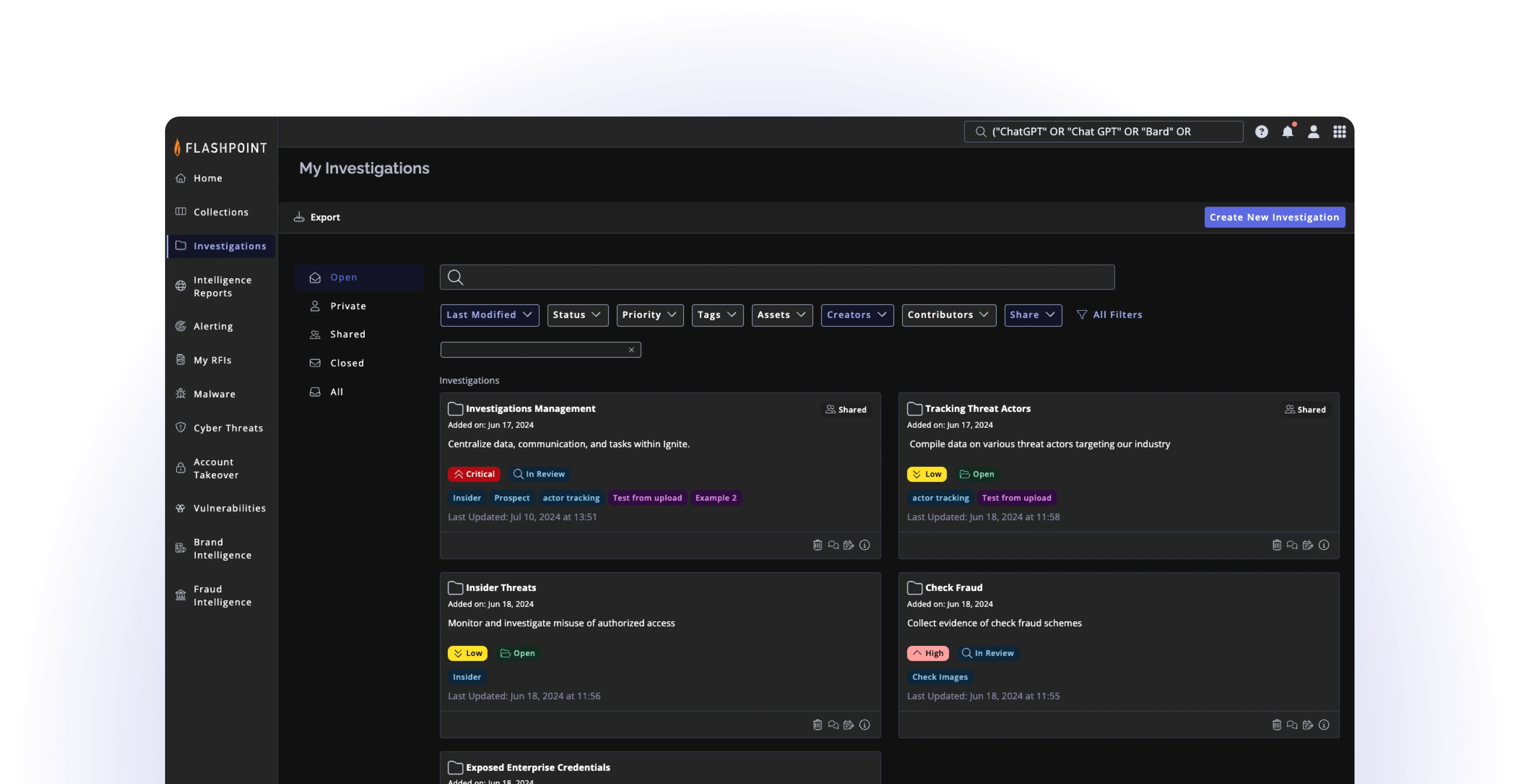 The dynamic threat landscape presents a complex web of hidden communications and evolving tactics. Traditional security solutions often fall short, leaving teams with incomplete information. Flashpoint CTI combines comprehensive data collection, AI-powered analysis, and expert human insight to deliver actionable intelligence, safeguarding your critical assets and operations.
