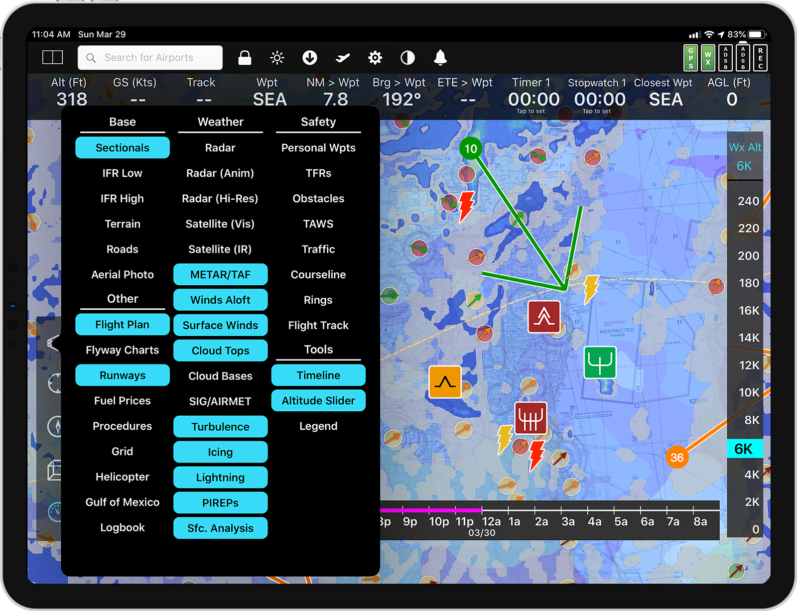 FlyQ+ keeps you safe with exceptional insight into current and expected weather conditions based on ADS-B and Internet-provided data. Add nearly 20 weather layers to the map and check "what if" scenarios with the Timeline and Altitude Slider.