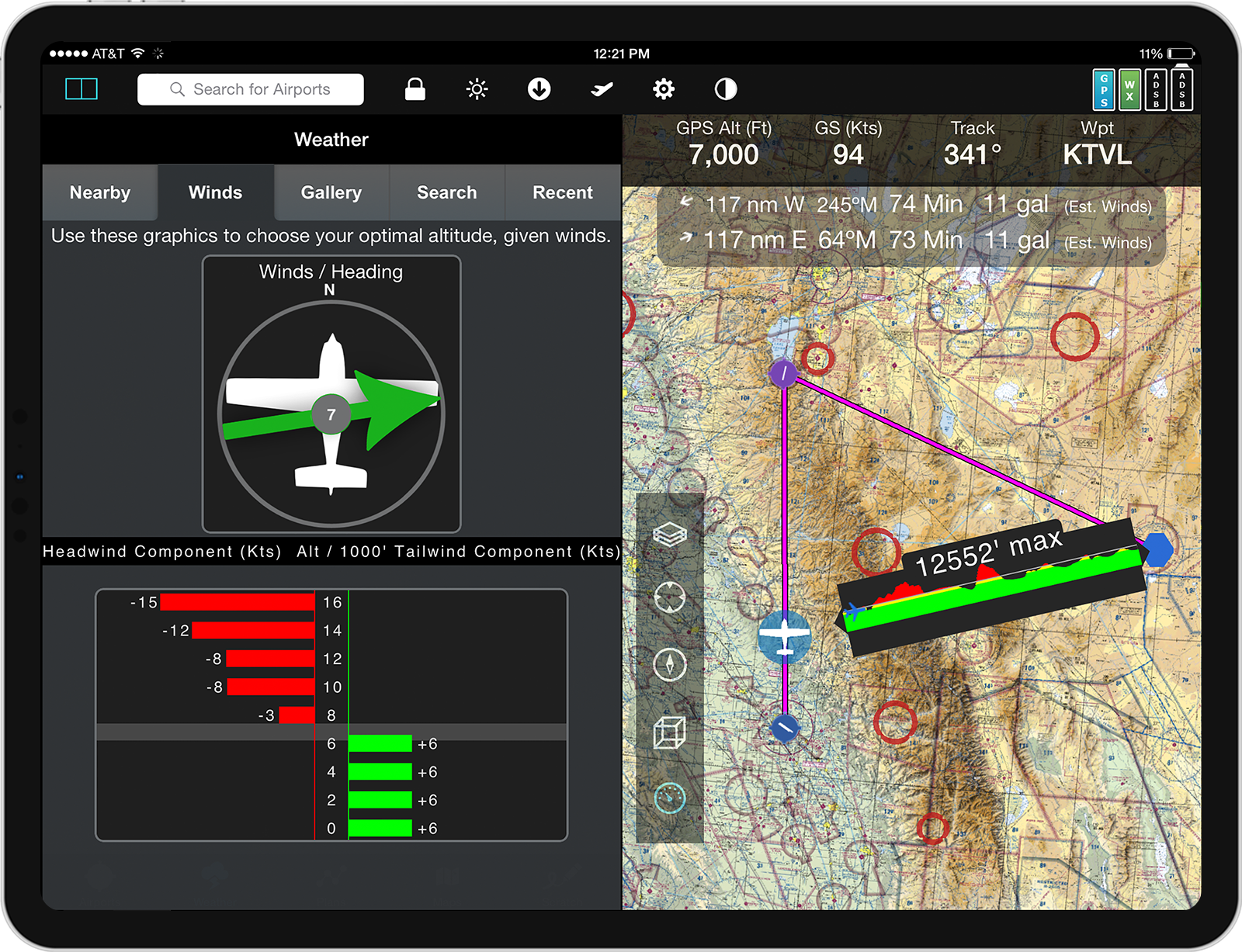 FlyQ's unique Wind Optimizer gets you to your destination faster by graphically showing you the best altitude. Use the Terrain X-Ray tool to check distance, bearing, flight time, fuel required, and safe terrain clearance between points.