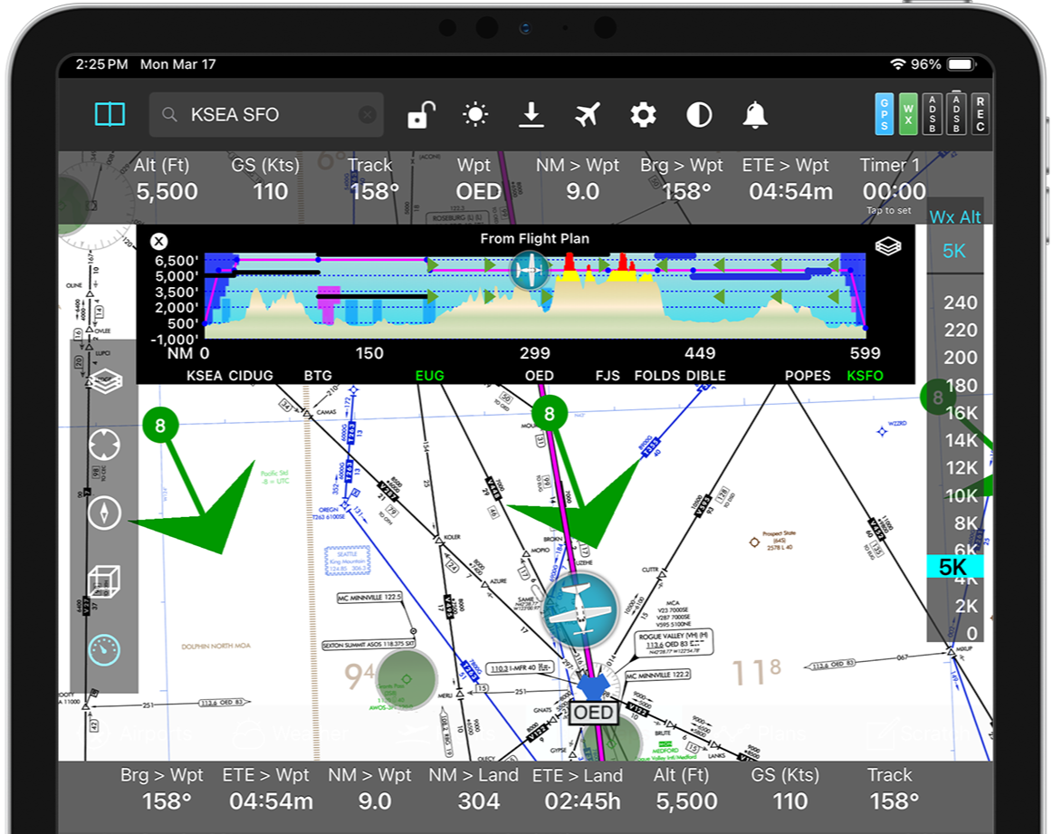 Flying is a three-dimensional exercise so we include a powerful Profile View that provides a “cross-section” of your flight. It shows your actual position over terrain (color-coded for terrain warnings), within airspace, over airways, and through several different weather layers. It's time-synchronized to your flight so it shows the weather you can expect at different points during the flight and you can pinch and zoom to focus on specific areas.
