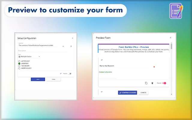 “Form Builder for Google Slides™” helps you to build Google Forms™ in a very simple and fast way by directly loading content from existing Google Slides™ as questions, answers, and images.