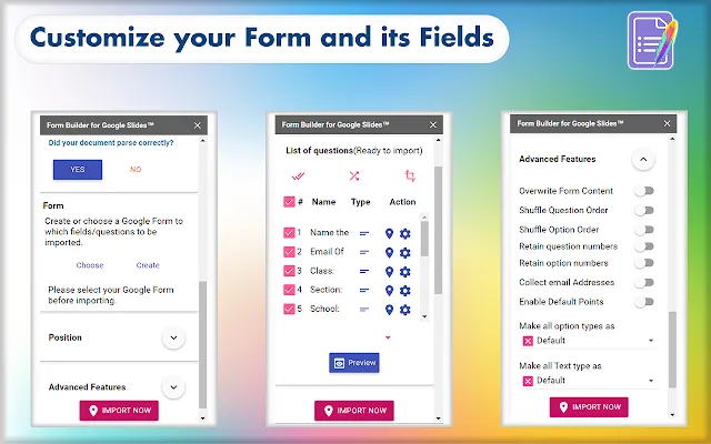 - Slide-to-Form Import: Load questions, answers, and images from Google Slides into Forms.