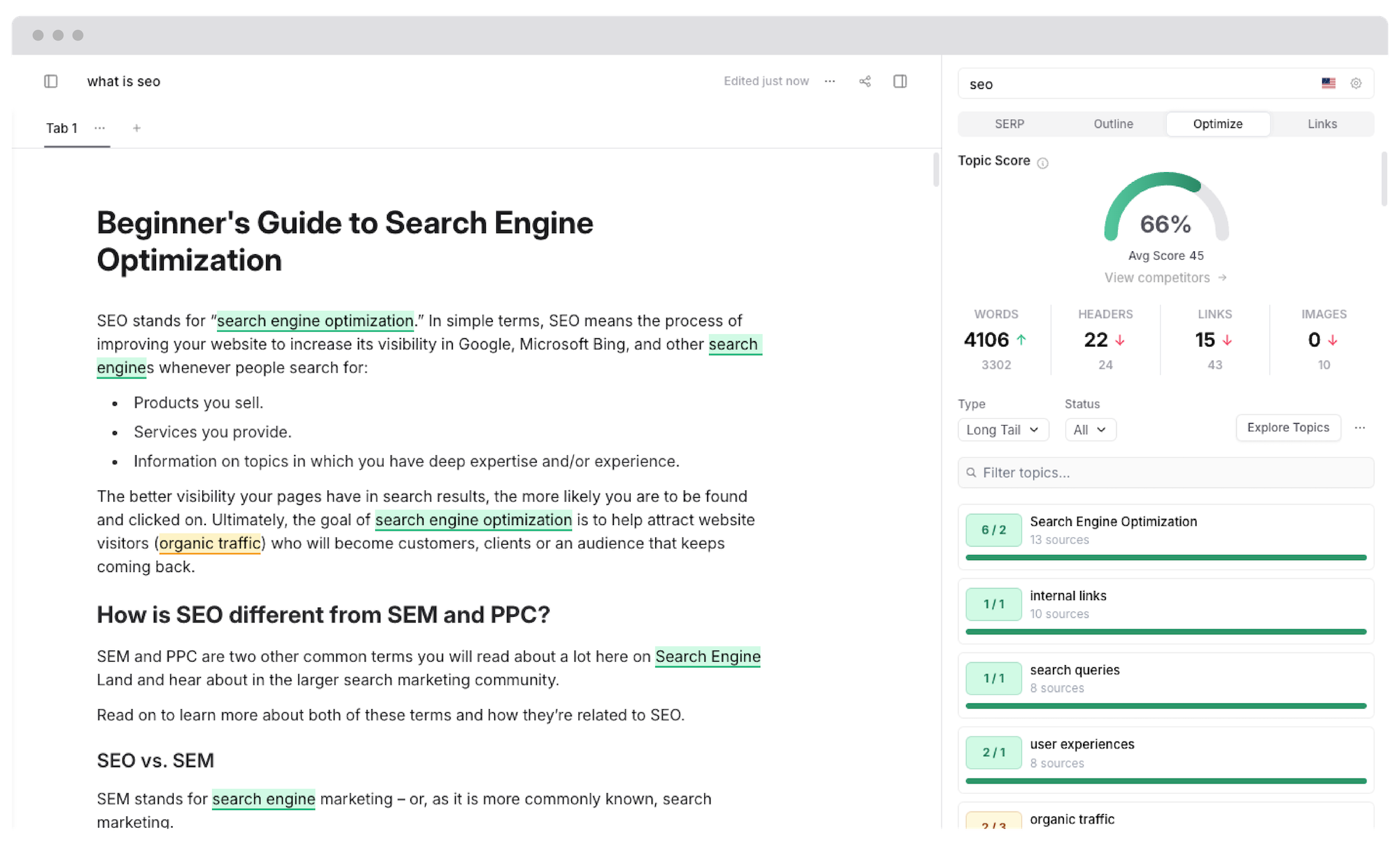 - Content Optimization: Compare your content to competitors and fill keyword/topic gaps.