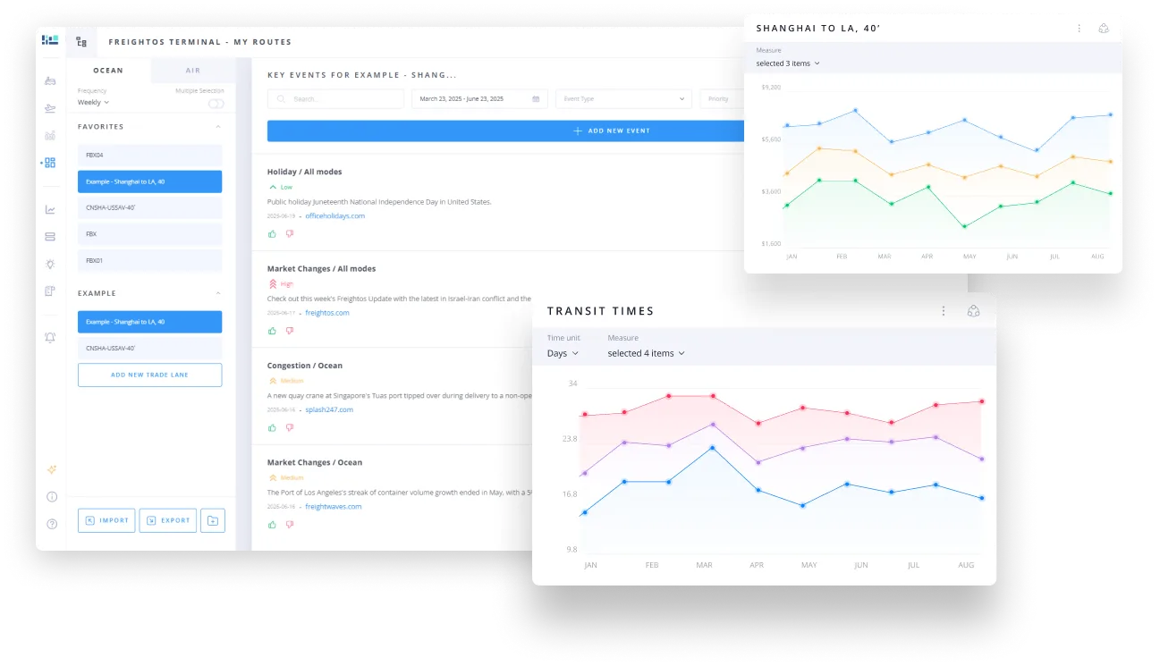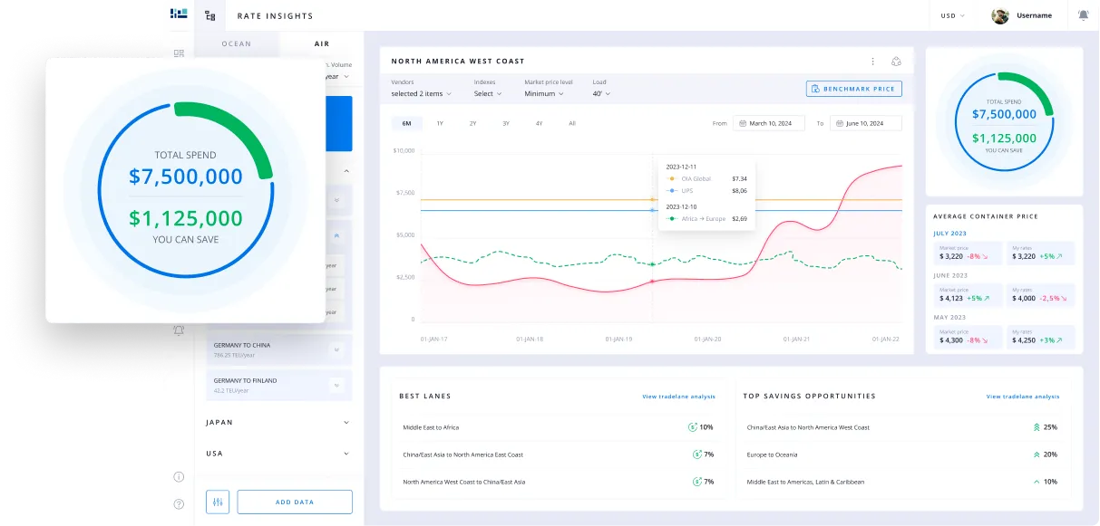 - Rate Benchmarking: Enables users to benchmark their freight rates against market trends with high-resolution data.