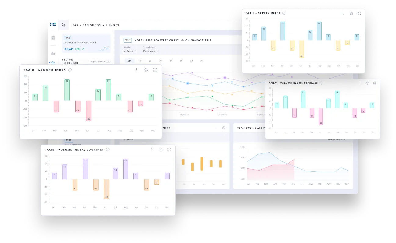 - Freightos Air Index (FAX): Offers real-time airport-to-airport air cargo pricing, with FAX Pulse providing additional indexes for supply, demand, bookings, and tonnage.