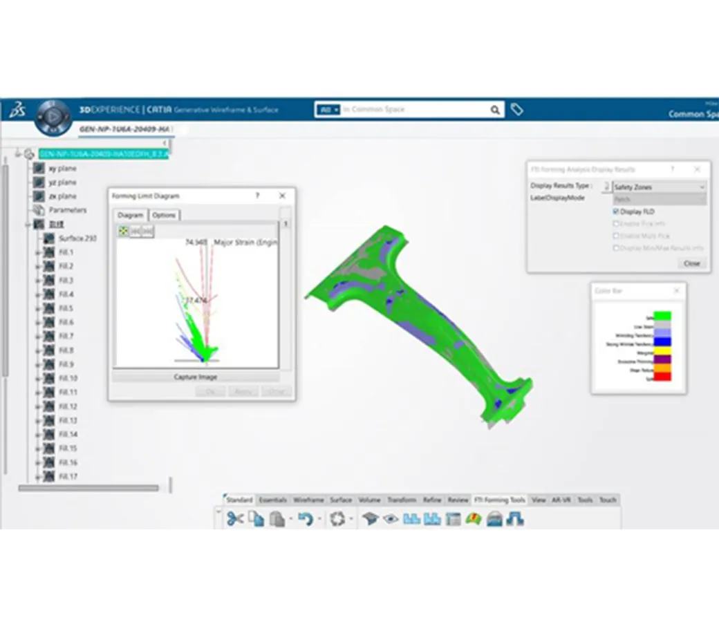 FTI CATSTAMP is a design engineering software solution developed by Hexagon for the automotive industry, specifically targeting sheet metal components. It enables users to swiftly evaluate part and process feasibility, determine optimal blank shapes, and analyze springback effects. By identifying formability issues such as splits and wrinkles early in the product life cycle, CATSTAMP allows engineers to implement design changes promptly, thereby saving time and reducing costs. The software considers various factors, including component or tool geometry, material properties, friction, binder, addendum, blank holder force, pad pressure, draw-beads, and tailor-welded blanks, to provide a comprehensive analysis of the forming process.