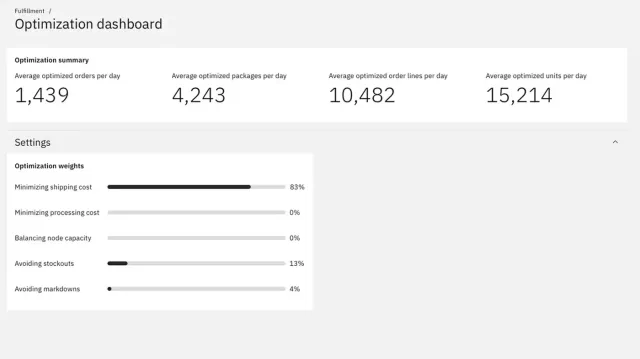 - **Use current order sourcing and optimization: **With Fulfillment Optimizer, you can execute new sourcing decisions in real time to minimize shipping costs. You can also balance across different business priorities based on time of year (peak, non-peak) while reducing cost-to-serve. You’re able to use cognitive capabilities to continuously learn and improve outcomes for omnichannel fulfillment.