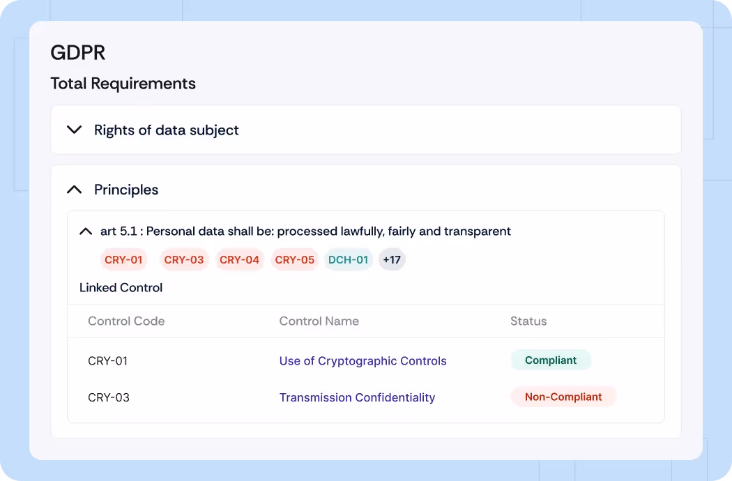Prebuilt controls for a faster start Easily implement GDPR-compliant privacy measures with prebuilt controls and content library. Upload existing data protection policies or create new ones with expert-vetted templates, all aligned with GDPR’s strict requirements. Scrut’s control set comes pre-mapped to the core articles of the regulation, so you can confidently cover everything from data processing principles to breach response, right from day one. Track control status, assign owners, and map compliance artifacts in real time with a drill-down dashboard—keeping your GDPR audit readiness airtight.