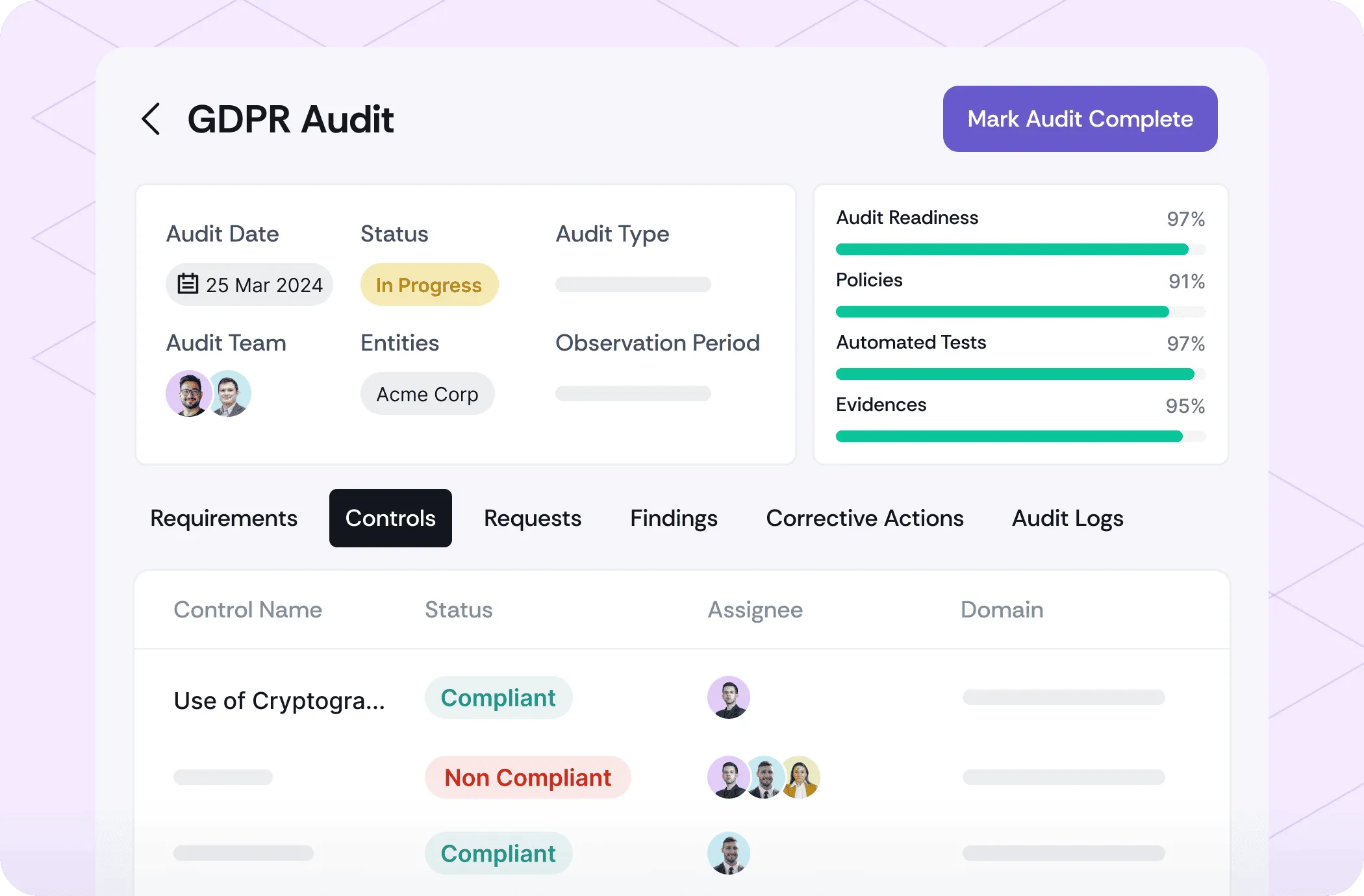 - Audit Collaboration: Invite auditors, manage findings, and streamline remediation.