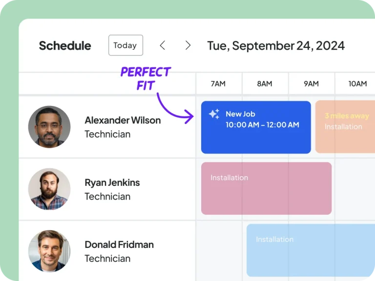 Automatically find the perfect time and tech for every job based on availability, proximity, and skill set.