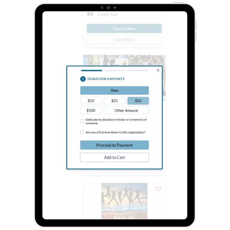 - Donor Checkout & Cart: A donation cart style checkout process enabling multiple gifts in one session, recurring giving options, and filters to help donors explore mission areas.