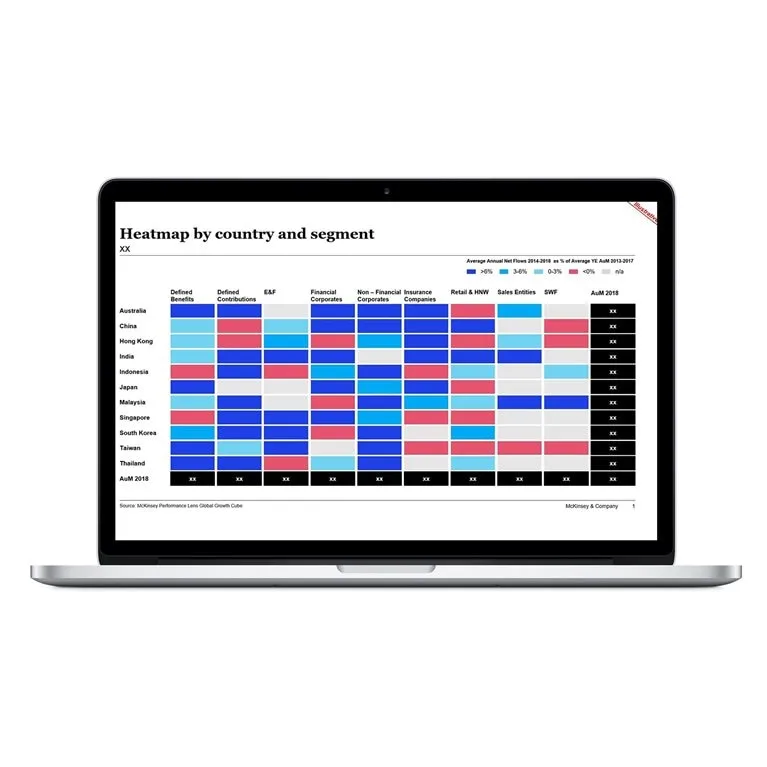 We consolidate hundreds of public and private data sources—including insights from McKinsey’s Global Asset Management Survey, McKinsey Global Institute, local consulting expertise, and our global research network—to size assets under management (AUM), net flows, and asset management revenues (focusing on management fees) from an investor domicile perspective. In addition, we develop deeper market insights on specific topics, such as retirement and retail distribution channels, to further inform and empower our clients' in their strategic planning.