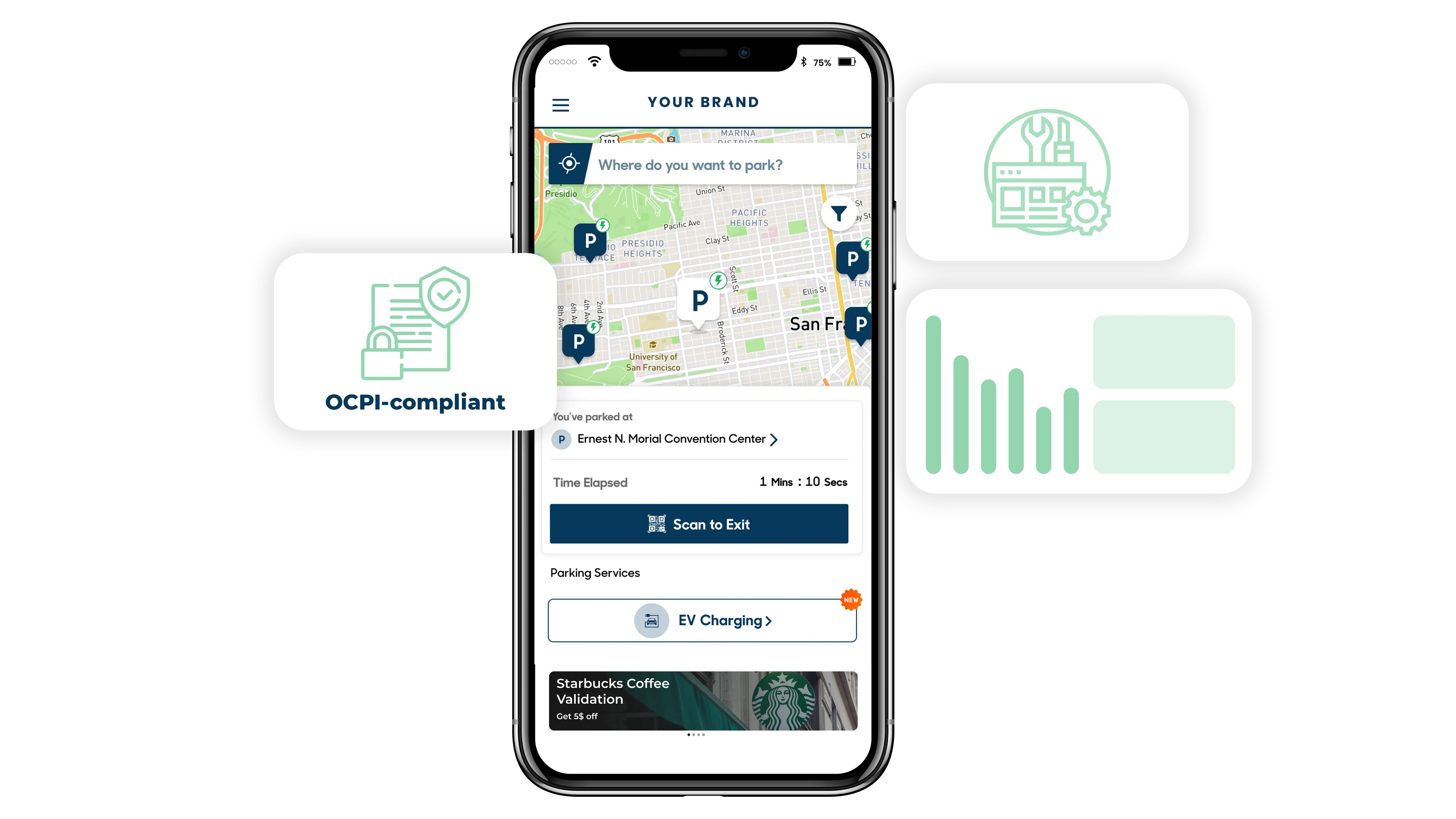 - Custom-Branded App: EV charging integrated into your branded parking app.