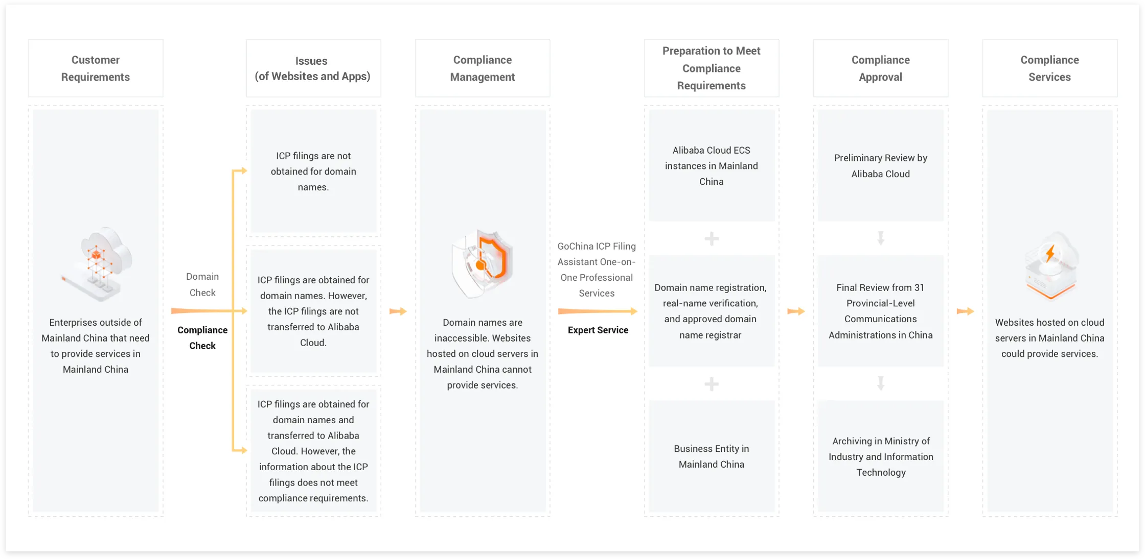 GoChina ICP Filing Assistant is a service that provides ICP filing (for websites and apps) consultation and delivery for enterprises outside the Chinese mainland. GoChina ICP Filing Assistant provides one-on-one and end-to-end expert service to ensure smooth business development in the Chinese mainland. The expert service includes ICP filing applications and consultation about company registration and domain name ICP filing. This way, you can provide services from websites that are hosted on cloud servers in the Chinese mainland.