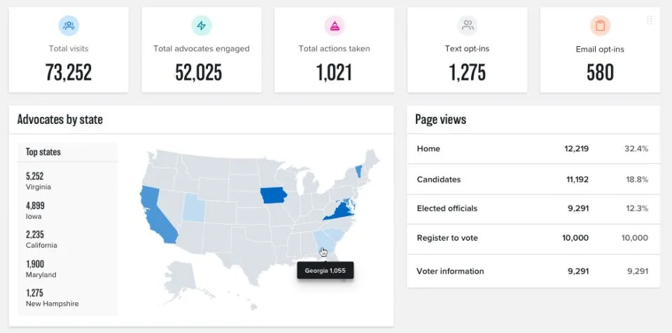 - Integrated Analytics: Track visits, engagement, and opt-ins to grow your advocacy base.