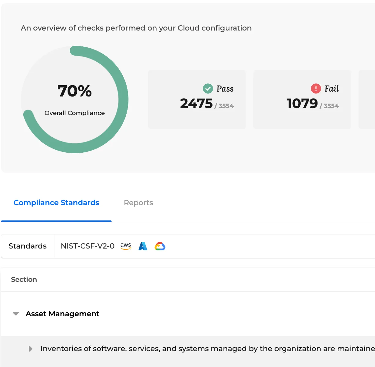 Agentless scanning which provides actionable outcomes based on a variety of compliance frameworks to focus your teams.