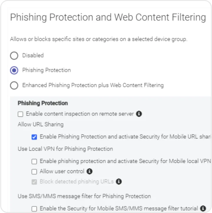 Web content filtering warns and prevents users from accessing potentially harmful websites and links, such as malware, phishing, botnets, and suspicious domains, or websites that violate your organization’s standards.