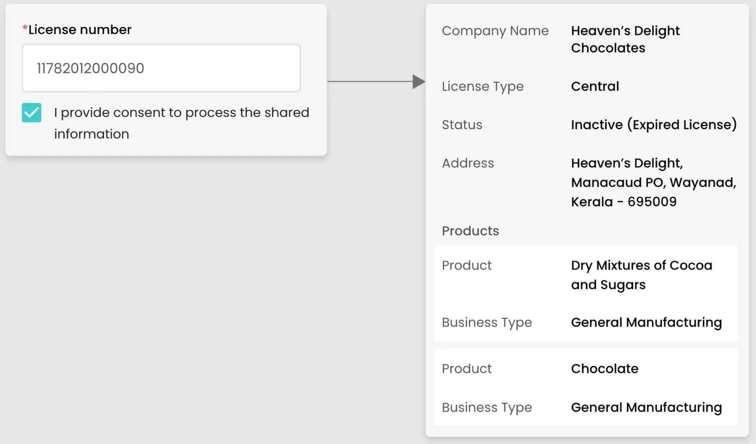 - Real-Time License Verification: Instantly fetch and validate FSSAI license details from official records.