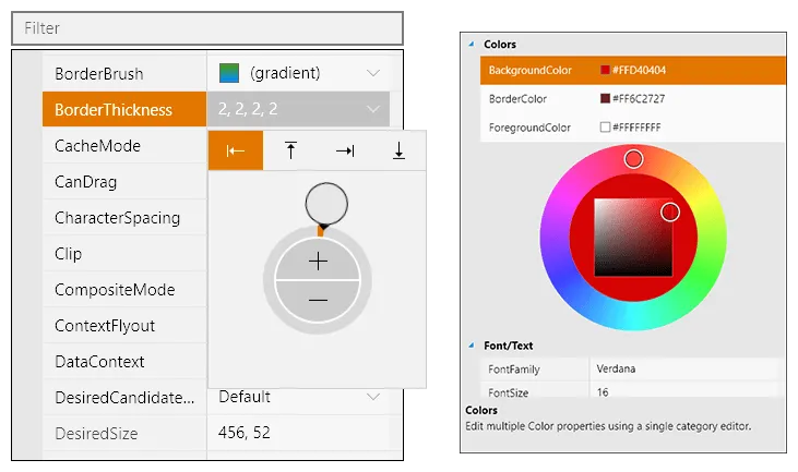 - **Category Editors: **When simple inline property editors are not enough, category editors can be used. These allow more complex interfaces to be used inside the property grid for presenting/modifying specified groups of properties.