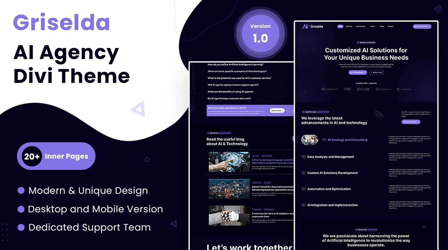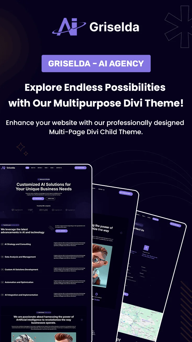 Griselda is a modern Divi child theme designed for AI agencies, tech startups, and digital businesses. It has a clean and professional layout, making it easy to showcase your AI services, case studies, and team members. The theme includes multiple prebuilt pages to help you launch your website quickly. Built with Divi modules, it is fully customizable without any coding skills. The prebuilt global header and footer ensure a smooth and consistent user experience. Griselda is fully responsive, ensuring your website looks great on all devices. This theme helps AI and tech businesses create a strong online presence and attract more clients.