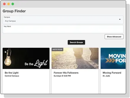 Groups are where people can gather, learn, grow, and serve. They are the cornerstone of discipleship, accountability, and ministry. Nurture members into the fold by allowing them to find a group that’s right for them using the group directory or a keyword search.